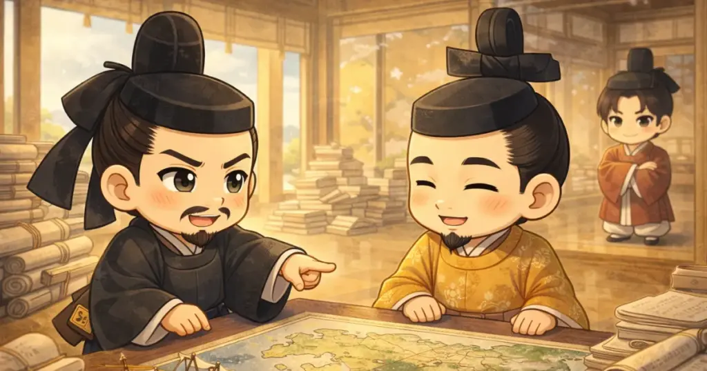 二人には「崩れかけた律令制を立て直す」という共通の目標がありました。しかし、そのアプローチの違いが、やがて埋めがたい溝となっていきます。時平は若さと実行力を武器に、土地制度の抜本的な改革などを強引に進めようとする「剛腕の実務家」でした。対して道真は、儒教的な理想に基づき、急激な変化よりも徳による統治や人材登用を重んじる「慎重な識者」の立場をとりました。