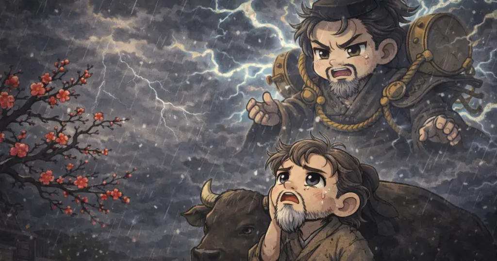 道真の死後、京の都では不可解な出来事が相次ぎました。まず、道真を陥れた藤原時平が39歳の若さで急死します。さらに、疫病が流行し、干ばつや洪水といった天変地異が頻発しました。人々は噂しました。「これは無実の罪で殺された道真公の祟りに違いない」と。